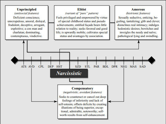"The compensatory variant essentially captures the psychoanalytic understanding of the narcissistic personality (discussed in a later section of this chapter). The early experiences of compensating narcissists are not too dissimilar to those of the avoidant and negativistic personalities. All have suffered 'wounds' early in life. Rather than collapse under the weight of inferiority and retreat from public view, like the avoidant, or vacillate between loyalty and anger, like the negativist, however, the compensating narcissist develops an illusion of superiority. Life thus becomes a search to fulfill aspirations of status, recognition, and prestige. Every small certificate and plaque the individual has ever received may be displayed on the office wall, for example. At other times, they may bore others while they present a complete biography of their most minuscule successes and achievements."Like avoidant personalities, compensating narcissists are exceedingly sensitive to the reactions of others, noting every critical judgment and feeling slighted by every sign of disapproval. Unlike avoidants, however, they seek to conceal their deep sense of deficiency from others and from themselves by creating a façade of superiority. Though they often have a degree of insight into their functioning, they nevertheless indulge themselves in grandiose fantasies of personal glory and achievement. Some procrastinate in doing anything effective in the real world for fear of evaluation. Instead of living their own lives, they often pursue the leading role in a false and imaginary theater unrelated to the real world. When threatened with reality, they may defend themselves by becoming more and more arrogant and dismissive until the offending stimulus withdraws. If reality overturns their illusion completely, compensating narcissists may retreat more and more into an imaginary world of others who recognize their supposed accomplishments" [3].